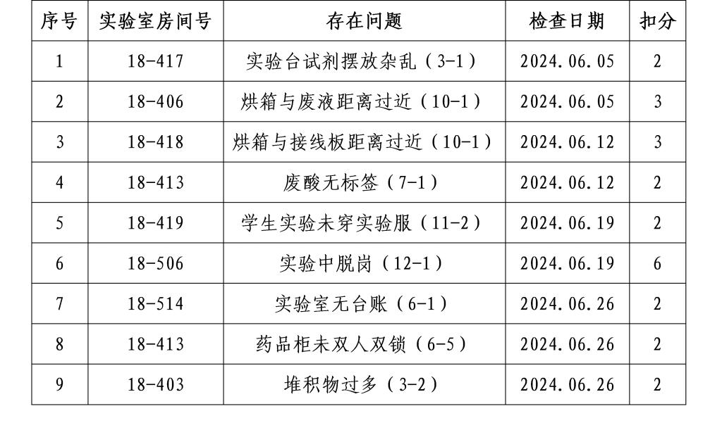 实验室仍存在烘箱放置不规范,实验过程中学生未按要求着实验服,实验过程脱岗,废液管理不到位,实验环境较差等问题。