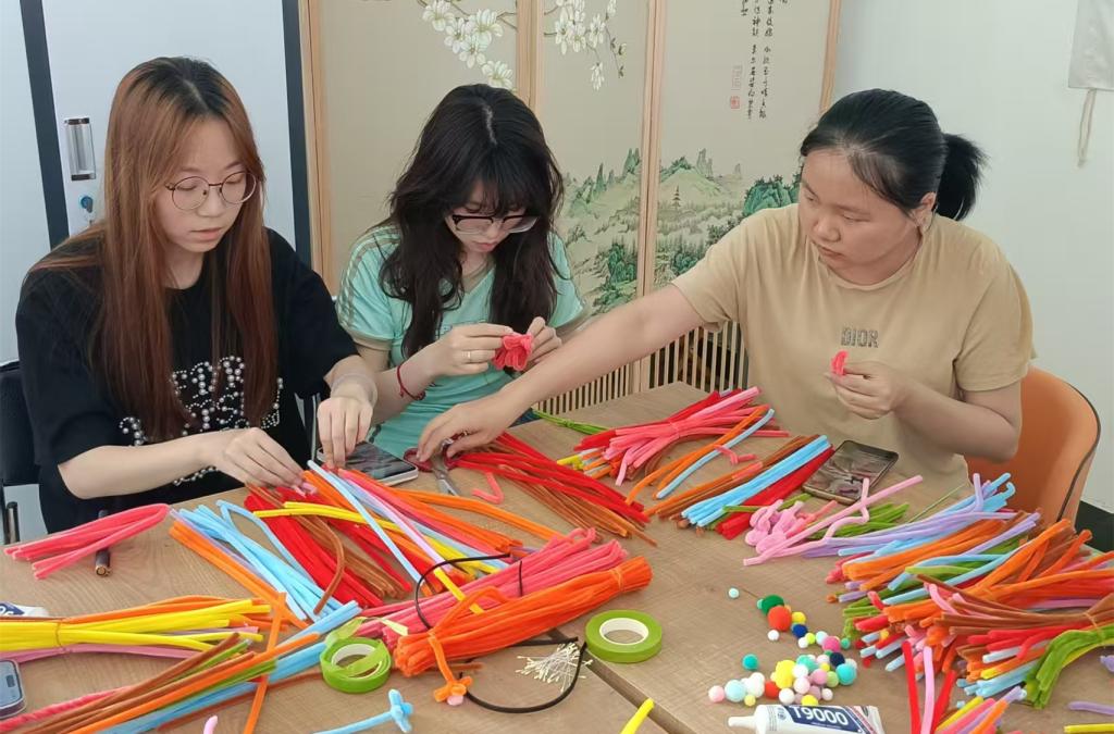 活动现场,五彩斑斓的扭扭棒、花蕊、精致花饰整齐摆放,在主持人的耐心讲解和示范下,同学们纷纷动手创作,充分发挥想象力,将普通的扭扭棒巧妙弯折、缠绕,有人将扭扭棒卷曲成层叠花瓣,打造出立体饱满的玫瑰;有人别出心裁地将扭扭棒弯折成爱心形状,点缀在花束中传递心意,为作品增添独特魅力。不一会儿,娇艳的玫瑰、可爱的向日葵、清新的郁金香等形态各异的花朵便在指尖绽放。活动最后,大家互相交流心得,现场气氛热烈而融洽。