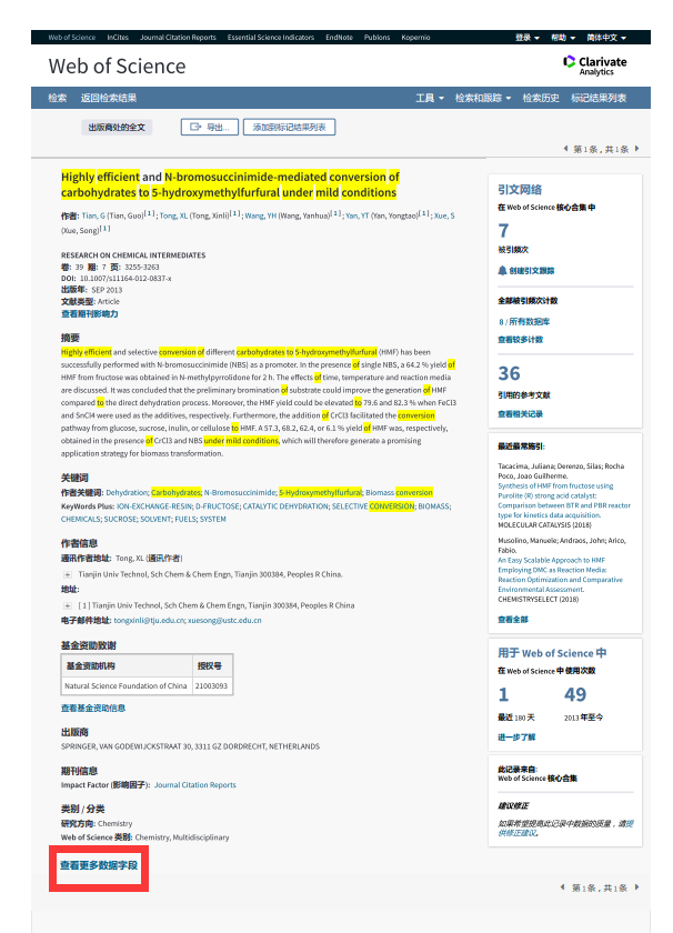 点击查看更多数据字段,将这一页面完整打印出来,或者点击页面上方的导出-打印-全纪录,即是论文的检索页。附