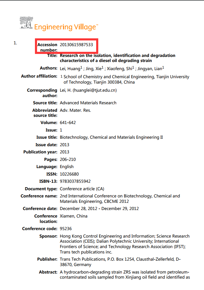 EI论文的检索号又叫Accession number,是一长串数字[如20142017714344],在其检索页的第一行出现,需点开检索页的Detailed方能看见。