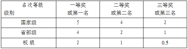 参评学年参加各种科技类竞赛获奖,根据下表进行加分。同一项目获多个奖励,不累计加分,只取加分最高的一项进行计算。团体奖赋分总值参照下表执行,由团队全体成员商议按照贡献度分配每位成员的分值。