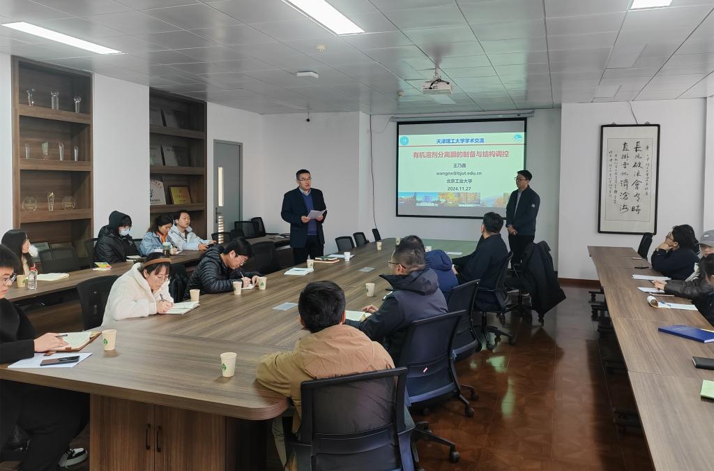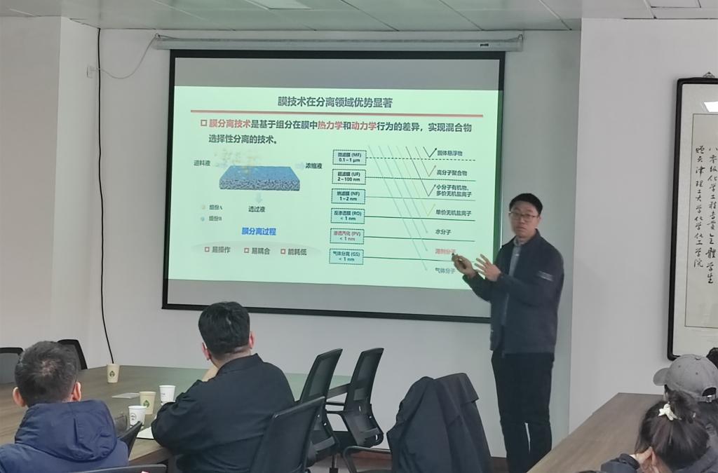 院长白国义教授主持会议并致欢迎辞。王乃鑫教授就发表的Science等论文,作了题为“有机溶剂分离膜的制备与结构调控”的学术报告,从MOF分离膜的制备、高效选择性吸附、有机溶剂的精准筛分、以及高性能分离机理四个方面,阐述如何解决分离膜选择性与渗透性相互制约的难题,最终获得高通量的有机溶剂分离膜。