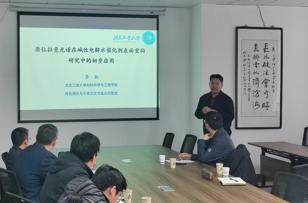 李钒教授作了题为“原位拉曼光谱在碱性电解水催化剂表面研究中初步应用”的学术报告,从碱性电解水制氢的催化电极材料出发,分析了两种新型高效电催化剂的设计与制备,通过原位电化学激光拉曼分析催化反应动态过程,解释电催化活性和稳定性提升的根本原因。