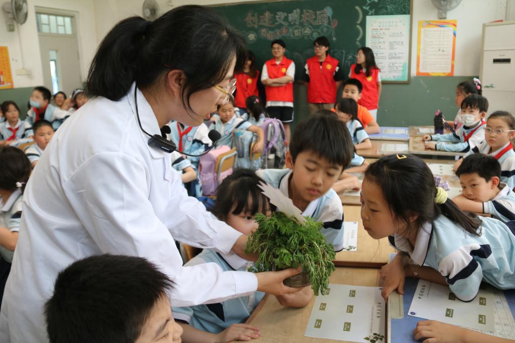 活动伊始,宣讲团成员、中药化学博士王红颖老师和大学生志愿者们,带领青少年阅读《本草纲目》《神农本草经》等经典药物学专著,了解典籍中蕴含的中医药知识和中医药传统文化。王老师以青蒿草为例,从其基源、性味归经、功效与临床应用开展讲解,通过讲解诺贝尔奖获得者、青蒿素之母屠呦呦和青蒿的动人故事,帮助青少年感受中医药传统文化魅力和新时代科学家精神。