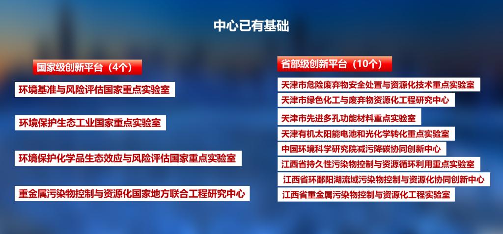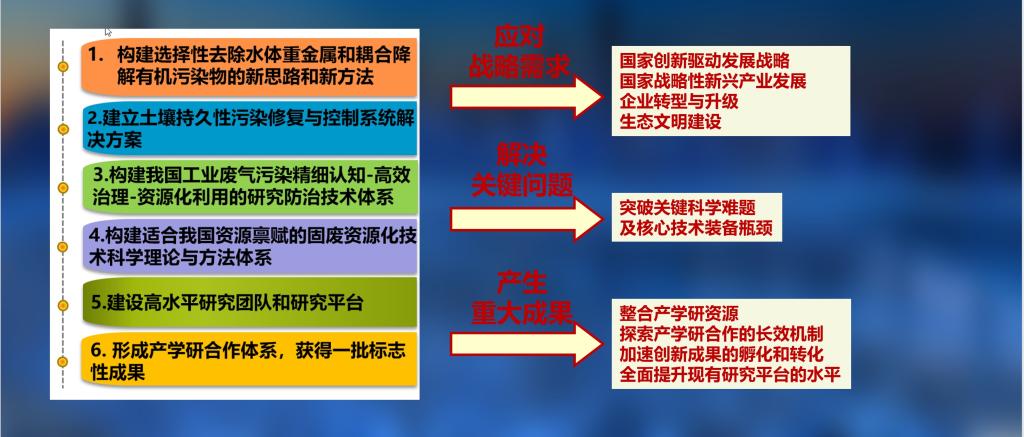 本创新中心拥有一批理论水平深厚的国家杰青和优青人才的科学家和工业实践经验丰富的产业专家为技术创新带头人,在整合4个国家级和10个省部级创新平台资源的基础上,以打造“卓越的工业废弃物绿色低碳循环利用技术创新创业生态体系和创新人才聚集高地”为一个总体目标,搭建“科技基础设施、产业关键技术研发、孵化转化与服务”三个平台,建设“创新创业、国际联合、知识产权管理运营”三个中心,建成一个“产业化基地”,以“协同创新的新模式和新机制”为保障,成为全国领先的工业废弃物绿色低碳循环利用技术创新“尖点”;成为工业废弃物绿色低碳循环利用人才和国内外创新机构汇聚的“高地”;成为研发模式创新和体制机制改革的“示范”;成为废弃物资源化产业发展的“引擎”。