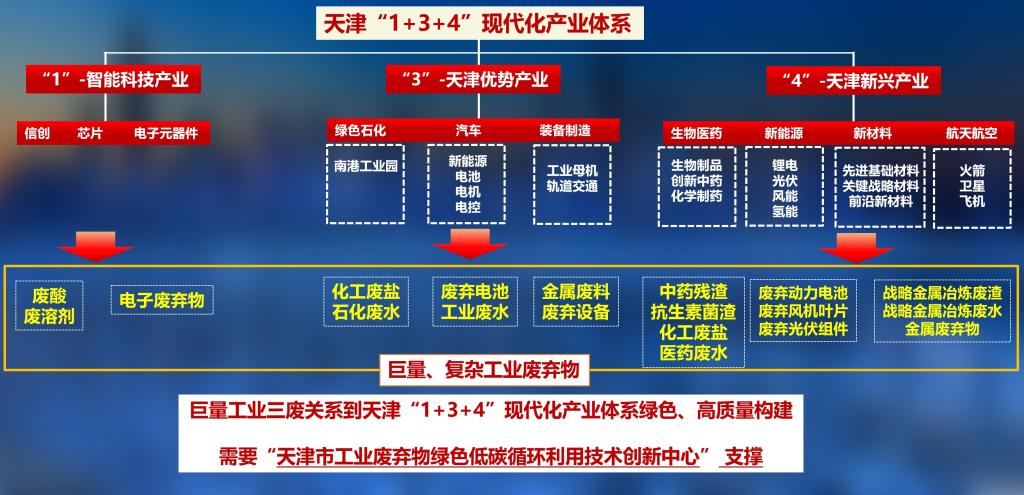 天津市工业废弃物绿色低碳循环利用技术创新中心是由天津理工大学牵头,联合中国环境科学研究院、中建三局绿色产业投资有限公司等14家单位联合组建而成,以化工、材料和资源环境等学科优势为基础,以“突破关键科学难题及核心技术装备瓶颈”为抓手,构建“源头减排、过程控制、末端治理、废弃物资源化综合利用”绿色创新技术体系。针对工业发展过程中产生的巨量工业废弃物,基于绿色低碳理念,围绕绿色化工过程强化的清洁生产技术、矿产资源全组份综合利用与开发、大宗工业危废安全处置与资源化、多种固废协同增值化利用与能量回收、化工重污染废水高效减量化与资源化利用等研究方向,开发工业废弃物安全处置及资源化处理技术及装备,创新绿色低碳工业过程与源头减排技术,构建“基础研究-技术研发-装备研制-工程示范”一体化创新链条,解决石油化工、精细化工、生物医药等天津市支柱产业和新兴产业的工业废弃物资源化利用瓶颈,践行绿色低碳发展理念和落实资源节约循环利用政策,完善循环发展产业链,真正实现天津市制造业高质量绿色发展。